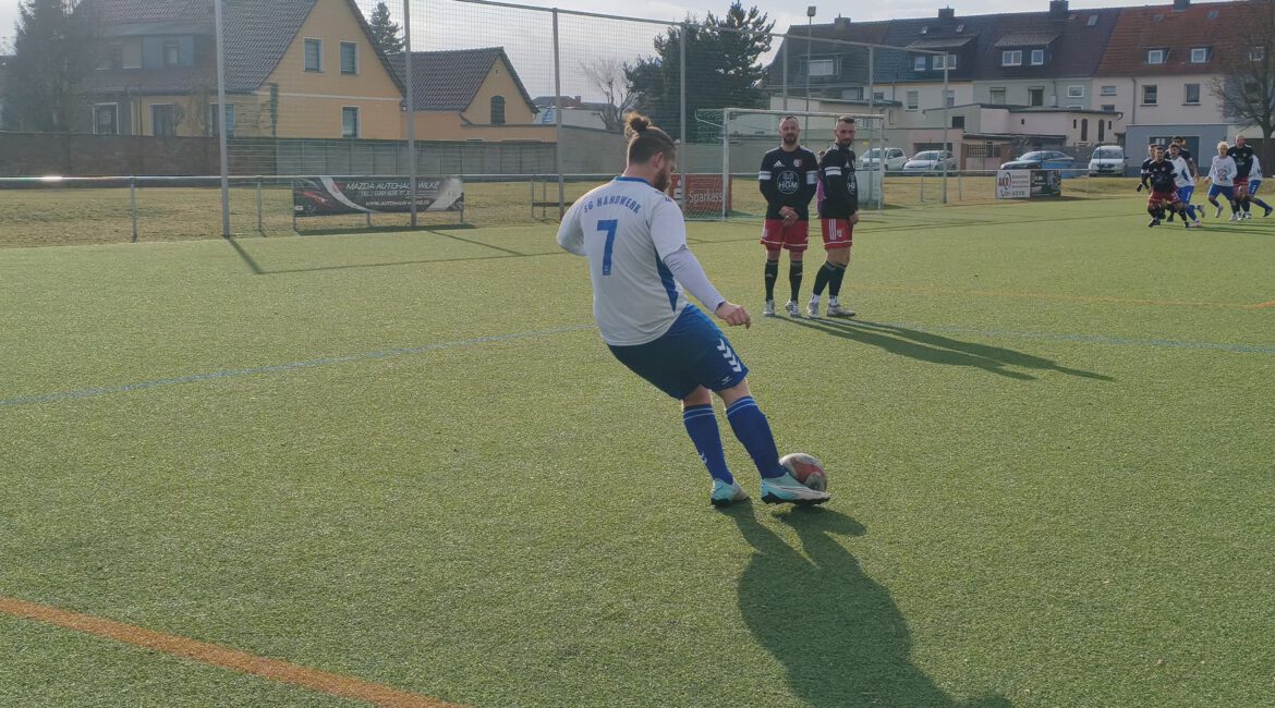 .Wer ist Mitte/Ende Februar der größte Gegner eines jeden Fußballspielers ? Genau, der Wettergott. So war erst Samstagvormittag klar, dass das Gastspiel der SG Handwerk bei Germania Olvenstedt stattfinden konnte. Der Untergrund strahlte also in saftigem Grün und die wenigsten der Akteure konnten wohl seriös einschätzen, wo man mannschaftlich und persönlich leistungsmäßig stehen würde.